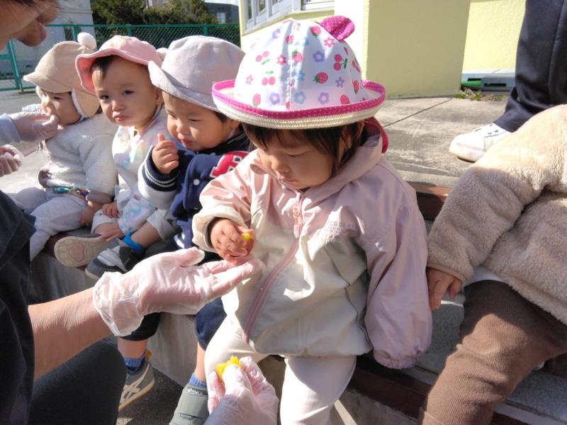 全園児がプレイルームに集合し、ひなまつりのお祝いをしました。園長先生からのお話しでは、今年も雛壇についての説明がありました。雛壇飾りはお内裏様とお雛様の結婚式の様子を表したもの・眉毛がない女の人は結婚をしているからなどのお話しを聞きながら、じっくりと雛壇を眺めていました。保育者の出し物では、ひな祭りクイズや3匹のこぶた・はらぺこあおむしのペープサートが行われました!親しみのある物語を笑って楽しく見ていた子ども達です♪また、ひな祭りクイズでは、沢山の子が「ハイ!」と手を挙げて、元気いっぱいに参加してくれました。3・4・5歳児はプレイルームにて会食でしたが、美味しそうにご馳走を食べ、とても喜んでいました♪