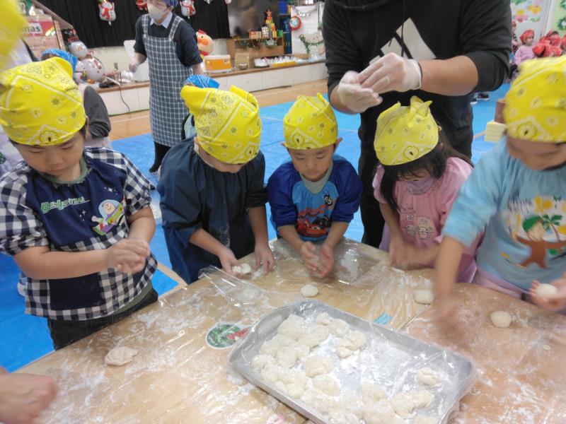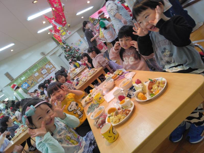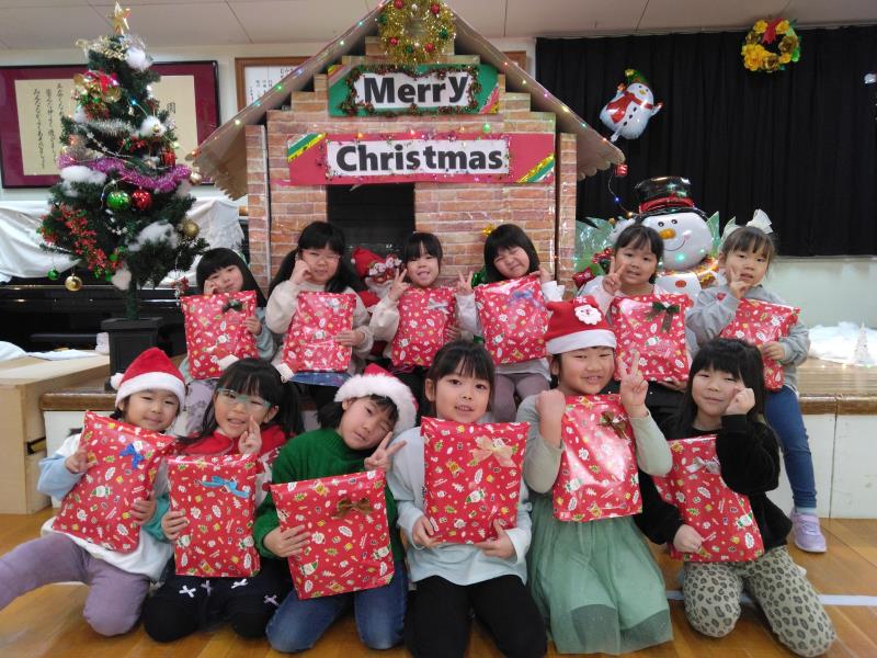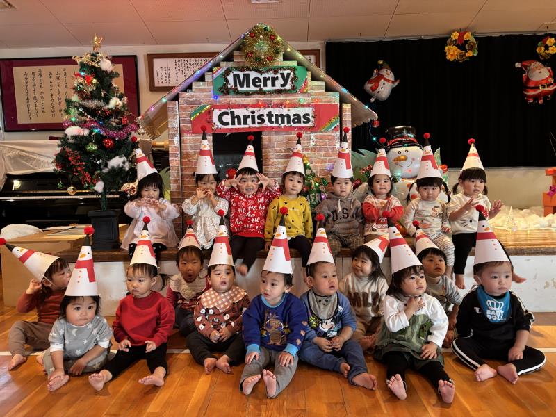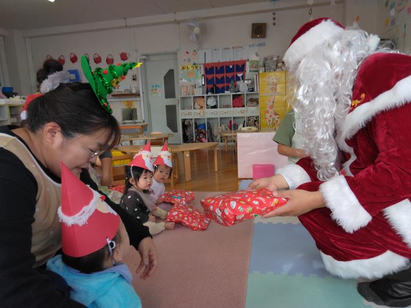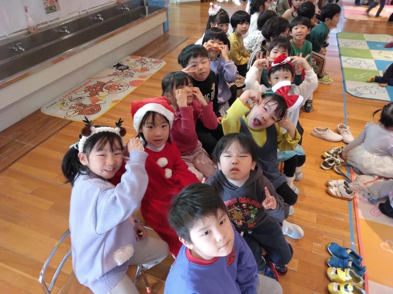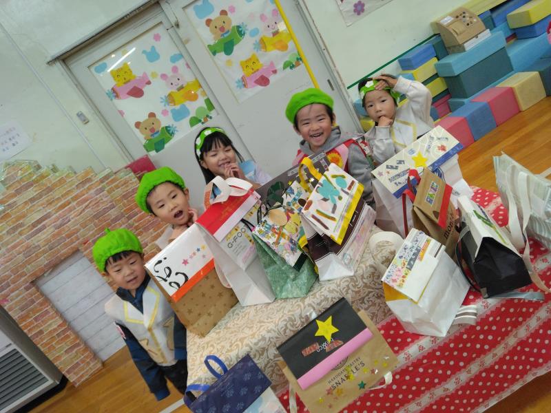 プレイルームでは全クラスが集まり、「あわてんぼうのサンタクロース」の歌をうたったり、「サンタは忙しい」の歌遊びをして皆で楽しく過ごしました。保育者からの出し物では鈴の音と共に「ジングルベル」の演奏とダンス「ジングルベルロック」を踊り、子ども達もノリノリで体を動かし、少し早いクリスマスを盛大に楽しんでいました。こども園を代表して、ひまわり組はサンタさんへ3つの質問をして、興味津々の子ども達は、集会が終わった後も、サンタさんの答えをしっかり覚えていました。2~5歳児は直接、手渡しでプレゼントをもらい、嬉しそうに「ありがとう」とお礼を言っていました。クリスマスの装飾や素敵なBGMと共にご馳走を食べる手も進み、おなかいっぱいの様子で満足そうな子ども達でした。