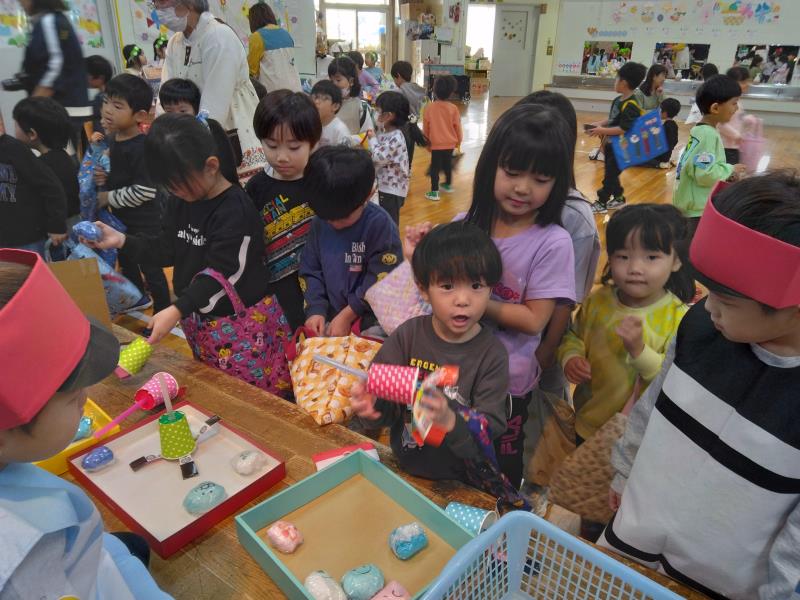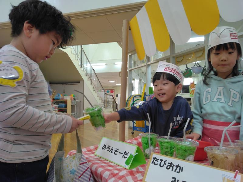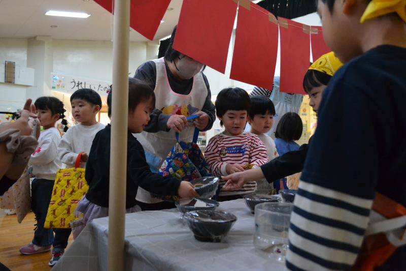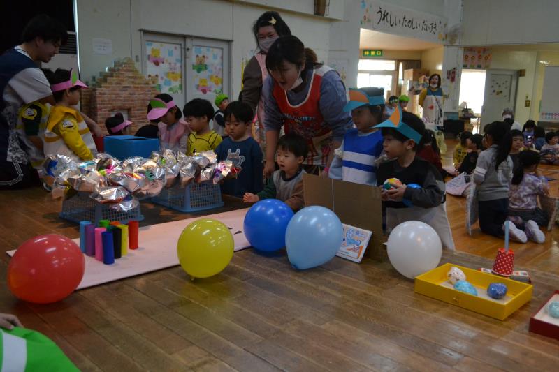 3月12日にお別れ進級パーティーを行いました。全クラスがプレイルームに集まり、ひまわり組さんは進学、他のクラスは進級のお祝いを込めて楽しい時間を過ごしました。卒園でお別れするひまわり組さんと各クラスごとに順番でレクリエーションをしていきました。0・1歳は「せんせいとおともだち」2歳は「ひっつきもっつき」3歳は「おやこドン!」という体でふれあう遊びをし、4歳は「ボール運びリレー」というチームになって競走するゲームをして楽しみました。どのクラスも楽しそうにひまわり組さんと交流を深めていました。食事は2歳児~5歳児までプレイルームで会食をして美味しそうに食べていました。今年度こども園のみんなで行う行事は最後、良い思い出ができました(*^_^*)